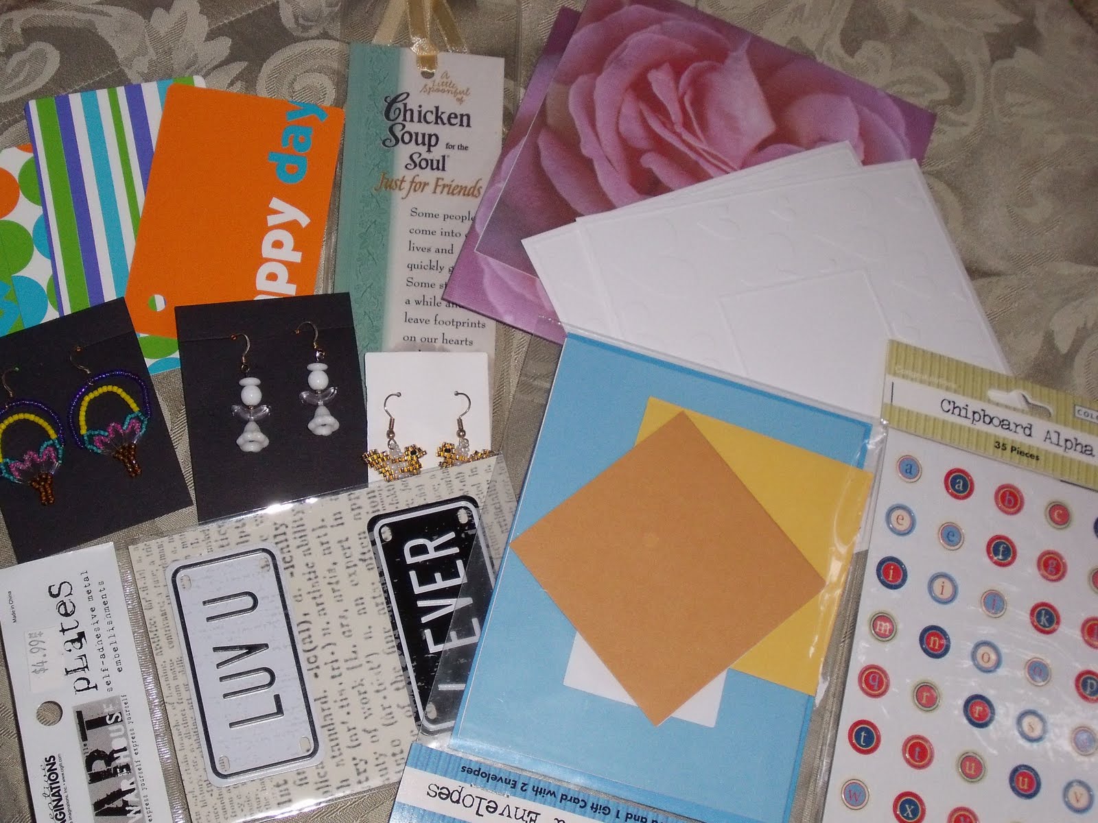 This is a collection of goodies that I won from the wonderful Brenda-Lea over at 'The Purple Lady' blog. Brenda-Lea had a 29 day giveaway...just for the sake of giving away. How generous is that. The white cards in the photo have hearts embossed all the way around the edge. Can't wait to get started on some cards with these. Aren't the earrings cute that she has made.